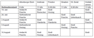 In den Monaten Juli und August starten wir unser Projekt „Sommerkirche“ und haben zusammen mit unserer Nachbar-Gemeinde Altenberg/Schildgen einen Gottesdienstplan entworfen, der es den Pfarrerinnen und Pfarrern ermöglicht, während der Sommerferien drei Gottesdienste pro Sonntag in der Region feiern zu können: